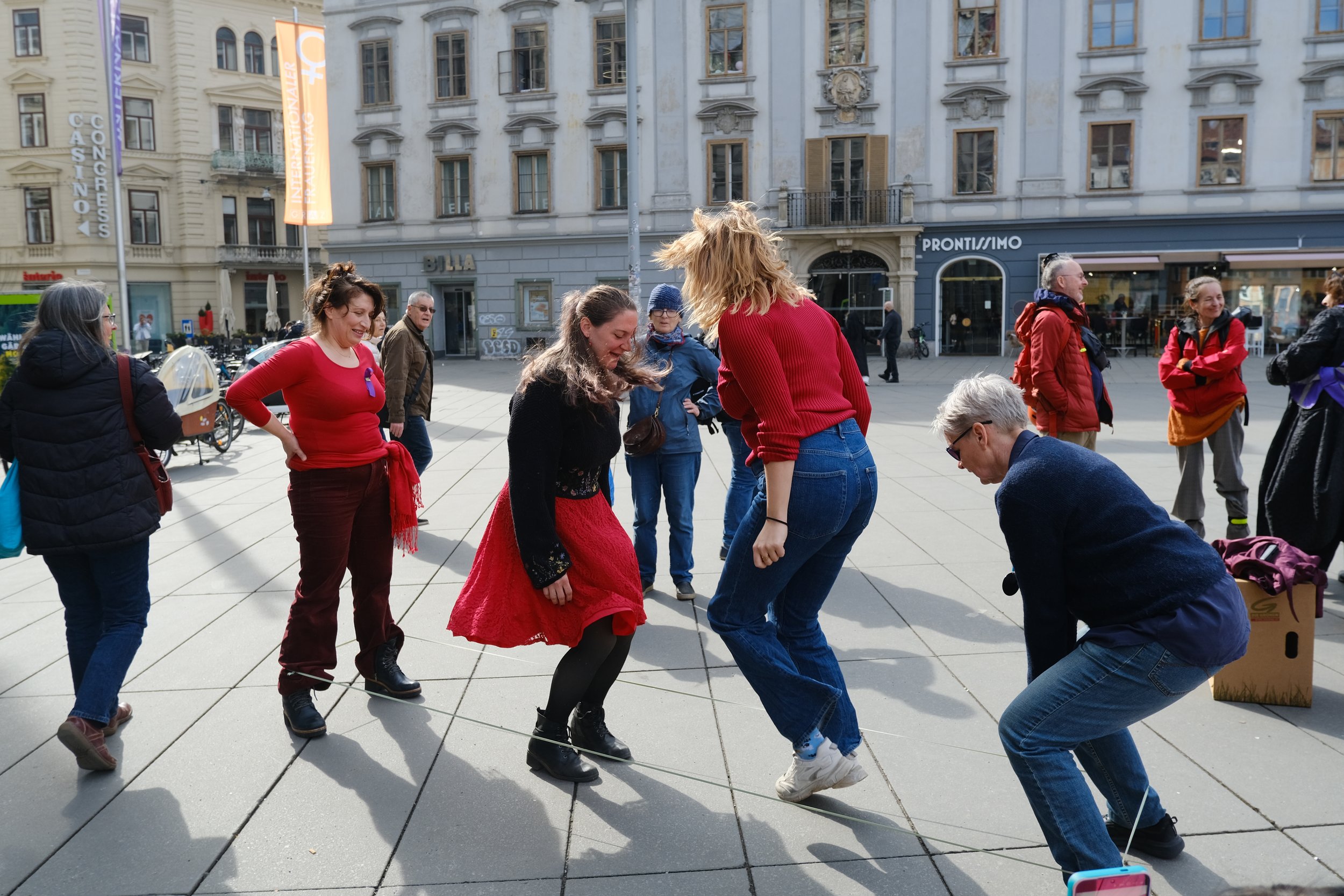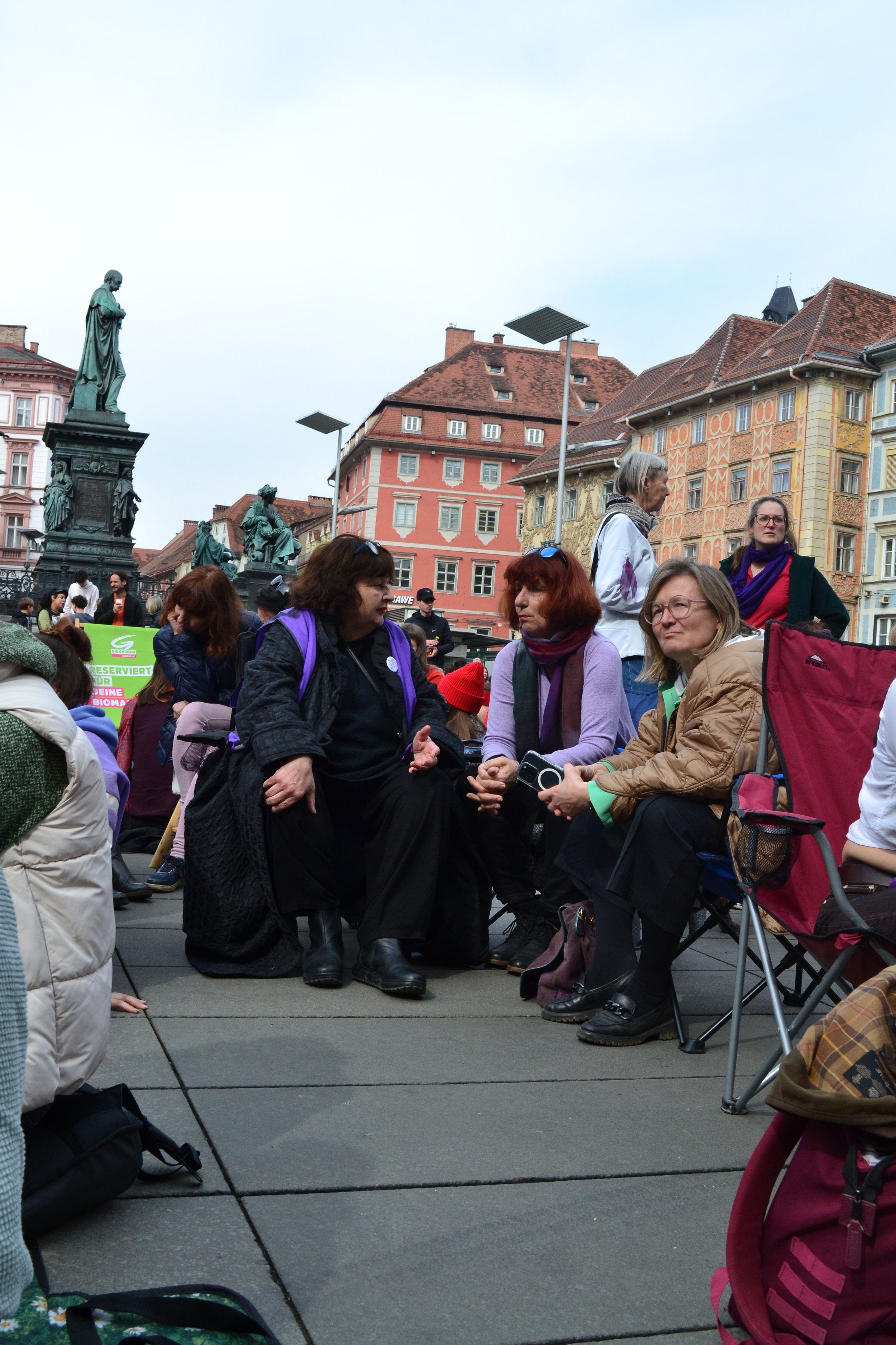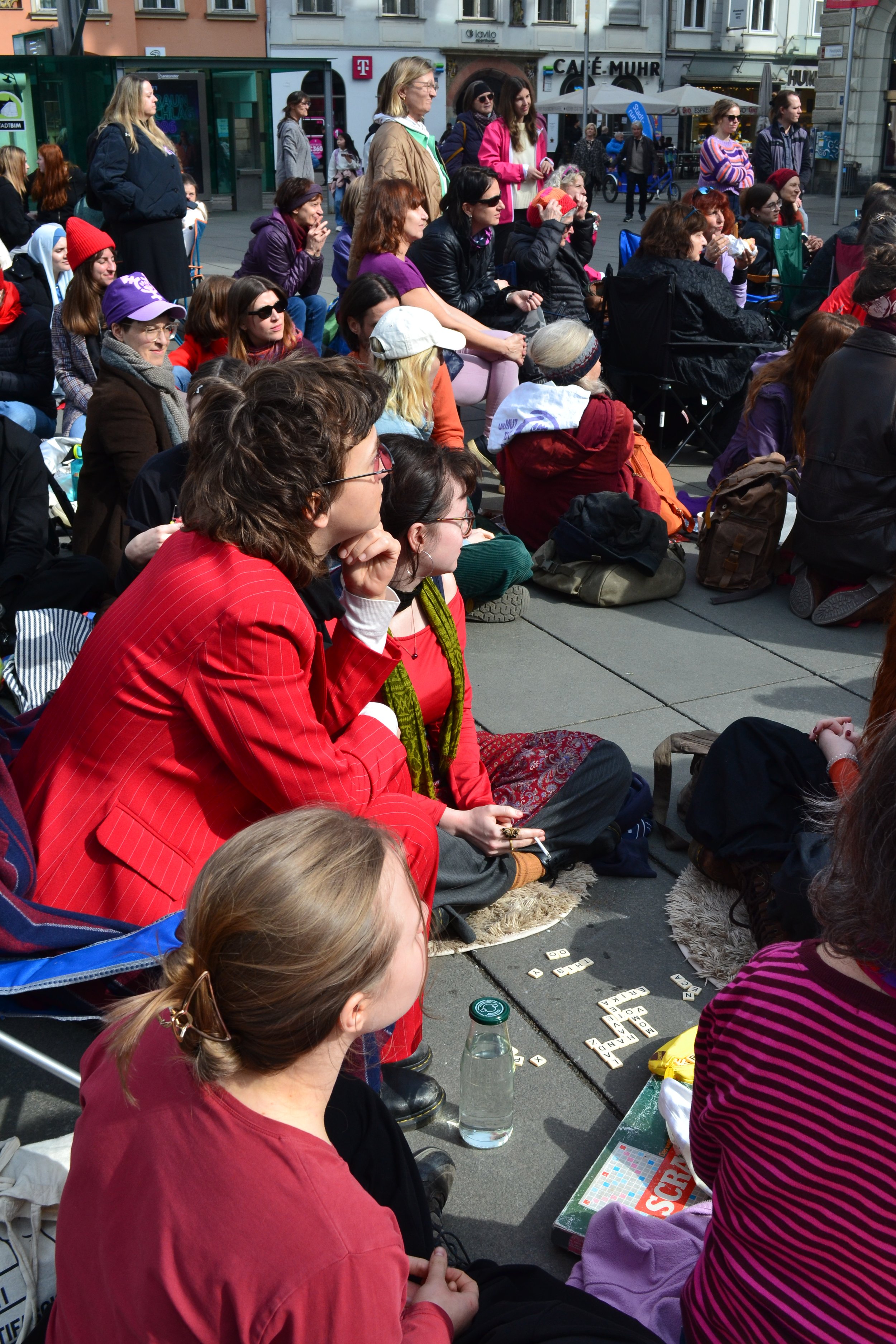 Ein angenehmes Grundrauschen aus Unterhaltungen, Lachen und Gesang begleitete die Versammlung. Es gab kein konkretes Programm vor Ort; manche Frauen haben eine Partie Karten gespielt, andere haben im Kreis gesungen, eine Frau im Schneidersitz zupfte auf ihrer Ukulele. Am anderen Eck des Hauptplatzes hüpften Frauen in Hommage an ihre Kindheit – sie haben ein Gummiband für „Gummihupf’n“ mitgebracht. „Das ist auch super gegen Osteoporose“, lachte eine Frau mit kurzen Haaren und drehte sich im Sprung.