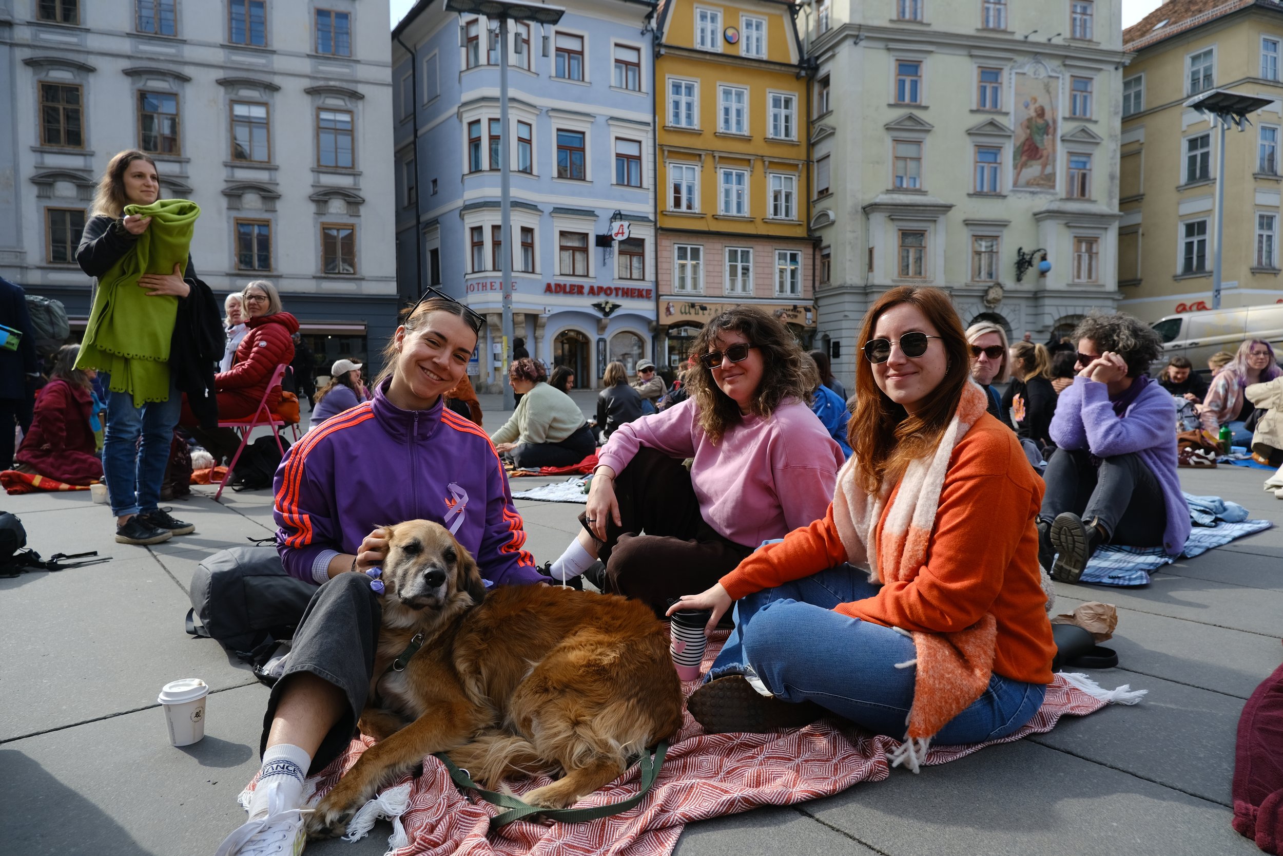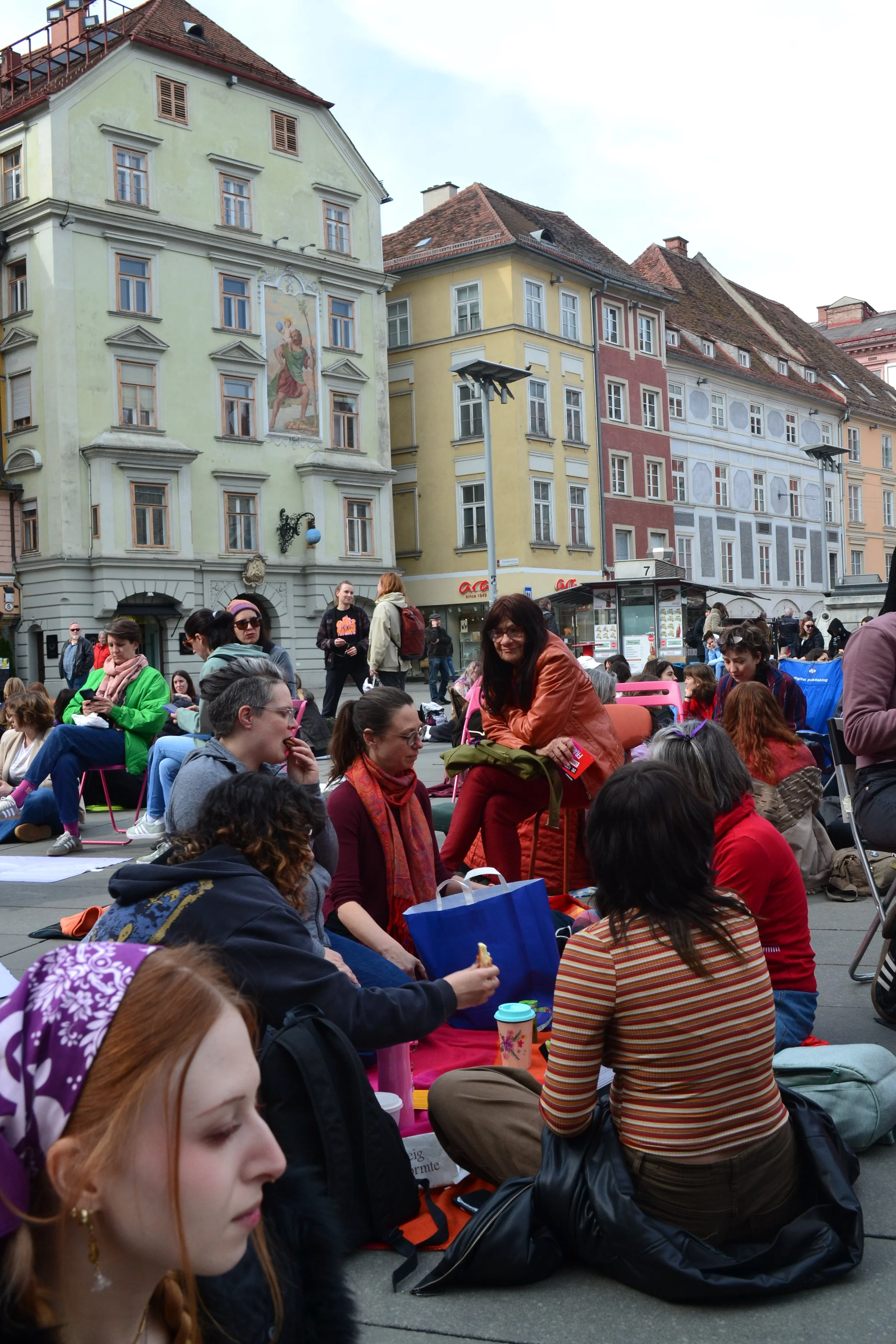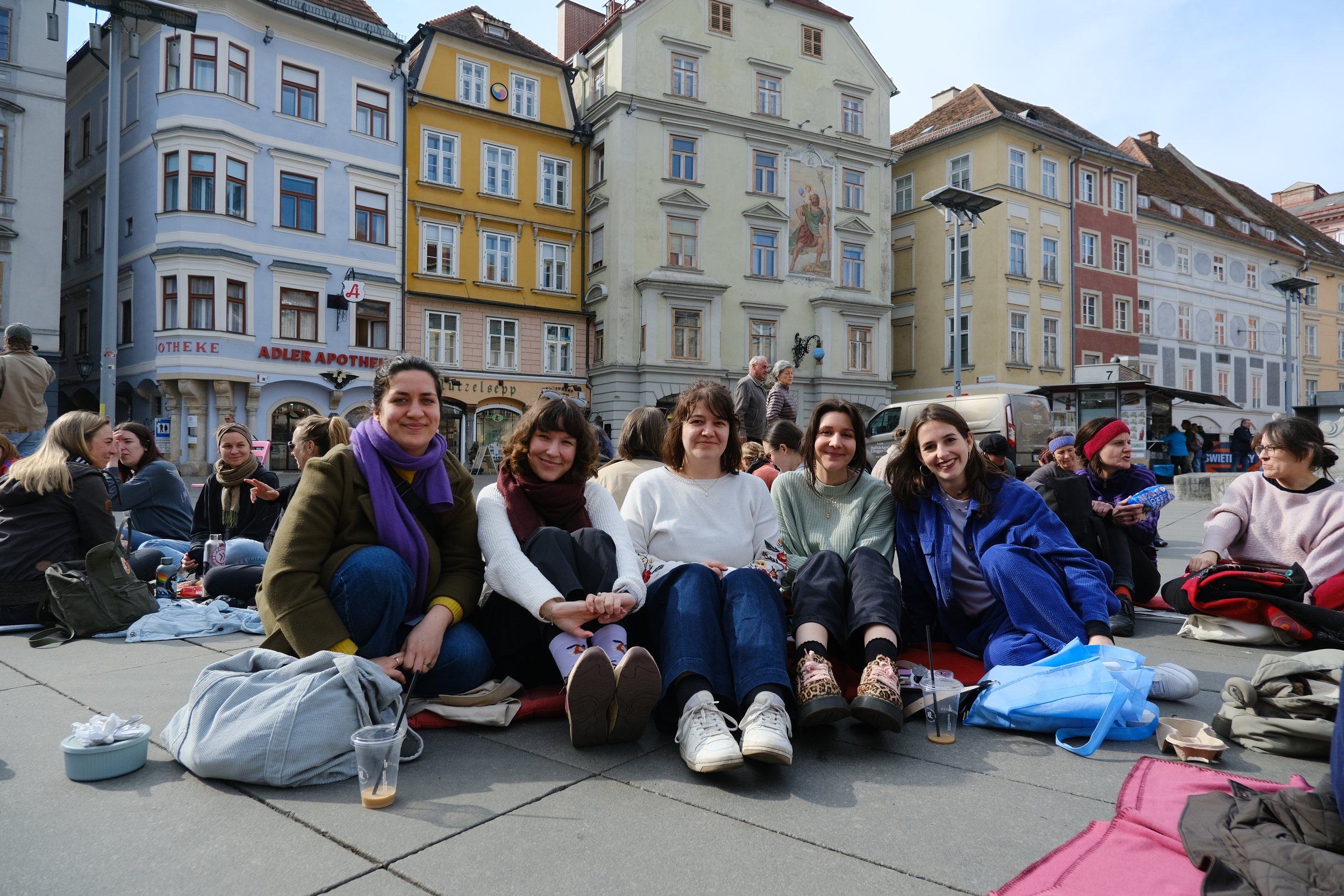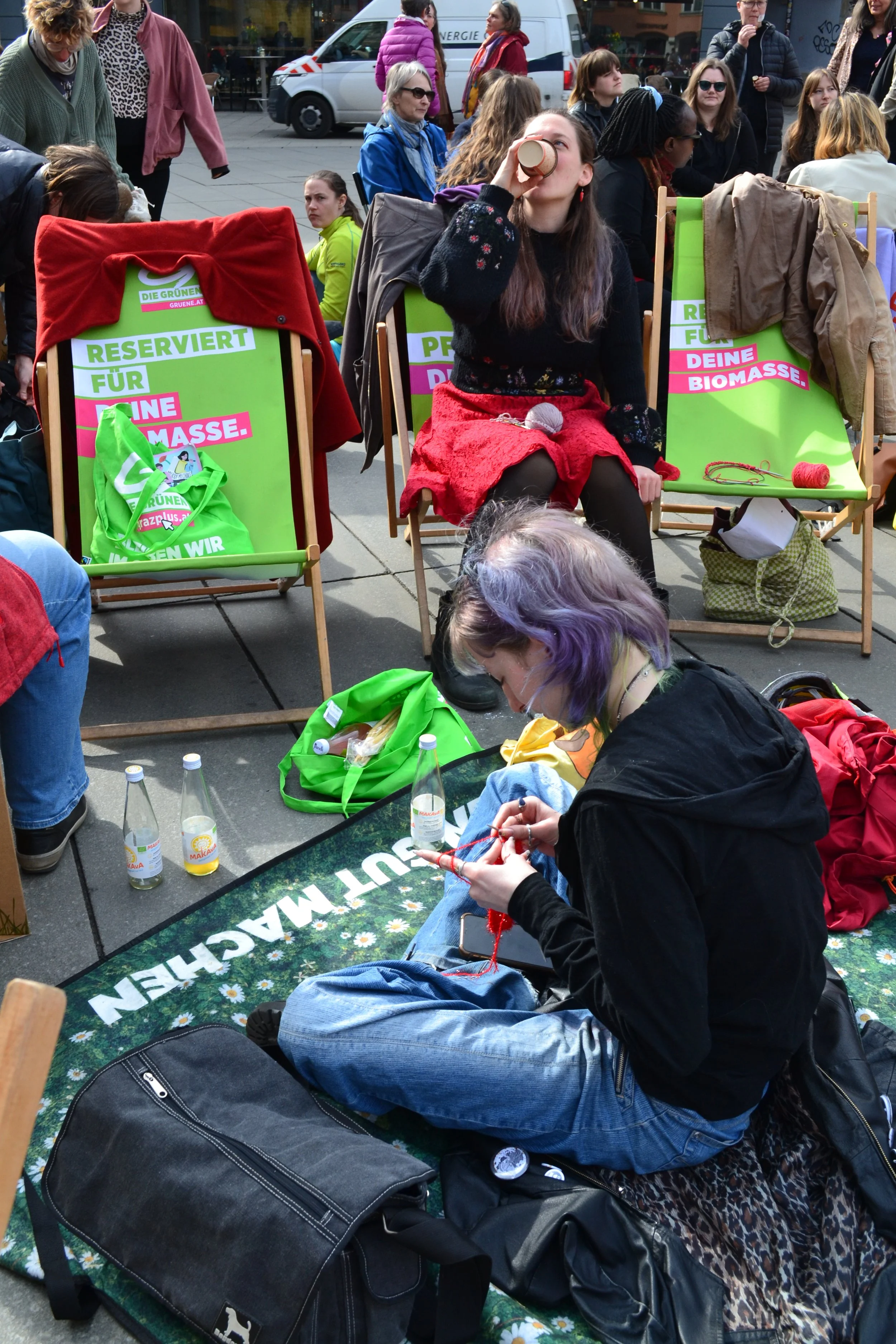 Ein angenehmes Grundrauschen aus Unterhaltungen, Lachen und Gesang begleitete die Versammlung. Es gab kein konkretes Programm vor Ort; manche Frauen haben eine Partie Karten gespielt, andere haben im Kreis gesungen, eine Frau im Schneidersitz zupfte auf ihrer Ukulele. Am anderen Eck des Hauptplatzes hüpften Frauen in Hommage an ihre Kindheit – sie haben ein Gummiband für „Gummihupf’n“ mitgebracht. „Das ist auch super gegen Osteoporose“, lachte eine Frau mit kurzen Haaren und drehte sich im Sprung.