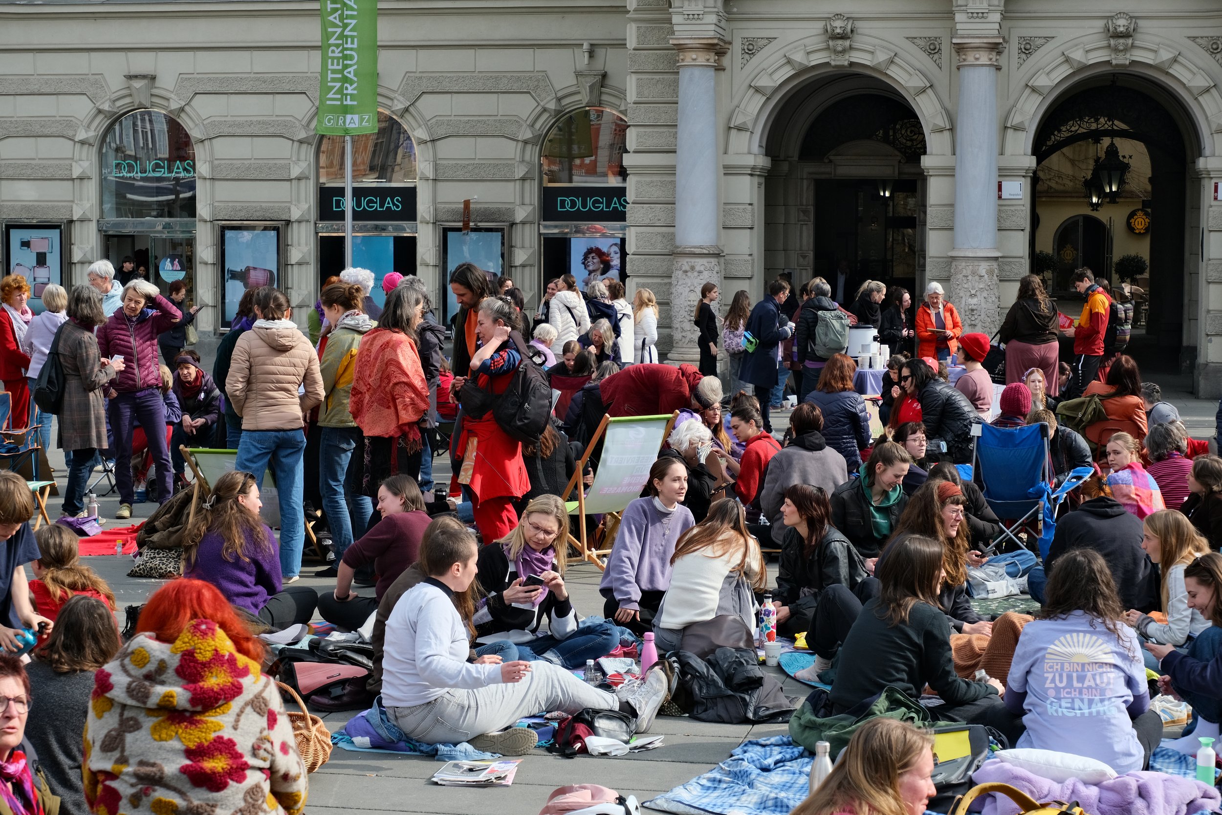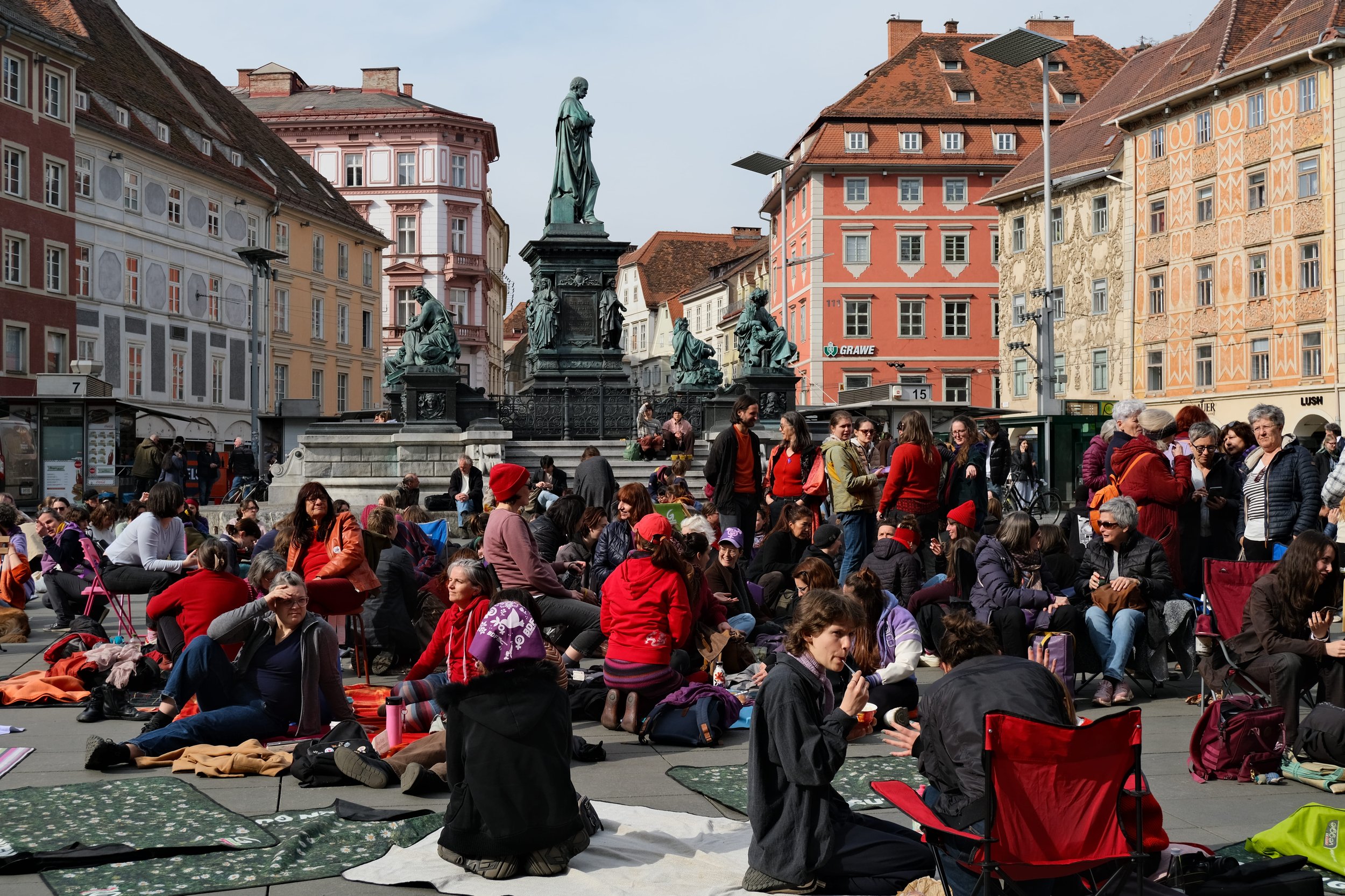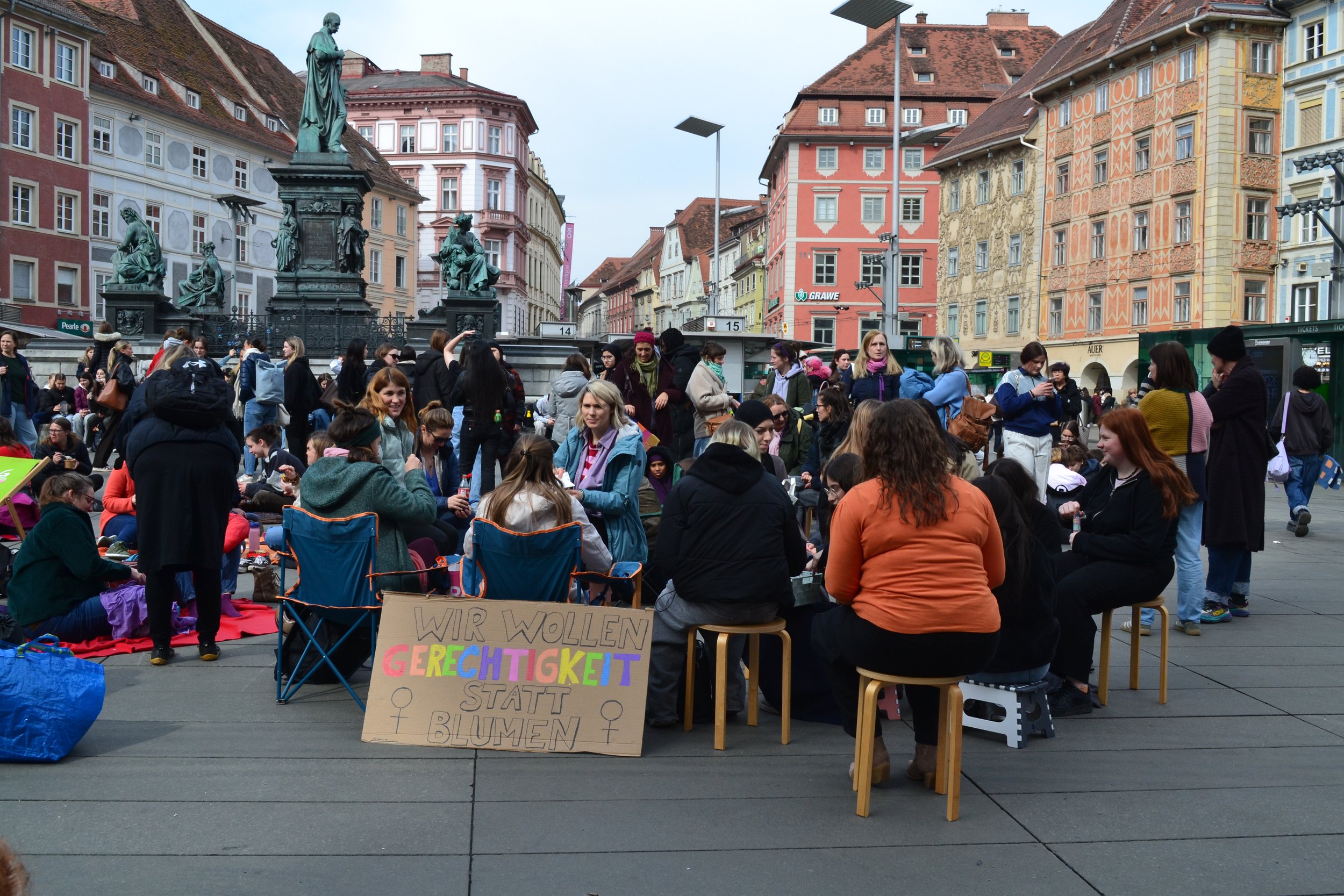 Am Montag, dem 9. März 2026, versammelten sich knapp 300 Frauen am Grazer Hauptplatz zum „Nichtstun“ – sie verweilten, kamen zusammen und machten mit einer zweistündigen Arbeitsniederlegung auf die gesellschaftliche, ökonomische und soziale Bedeutung der Arbeit von Frauen aufmerksam.