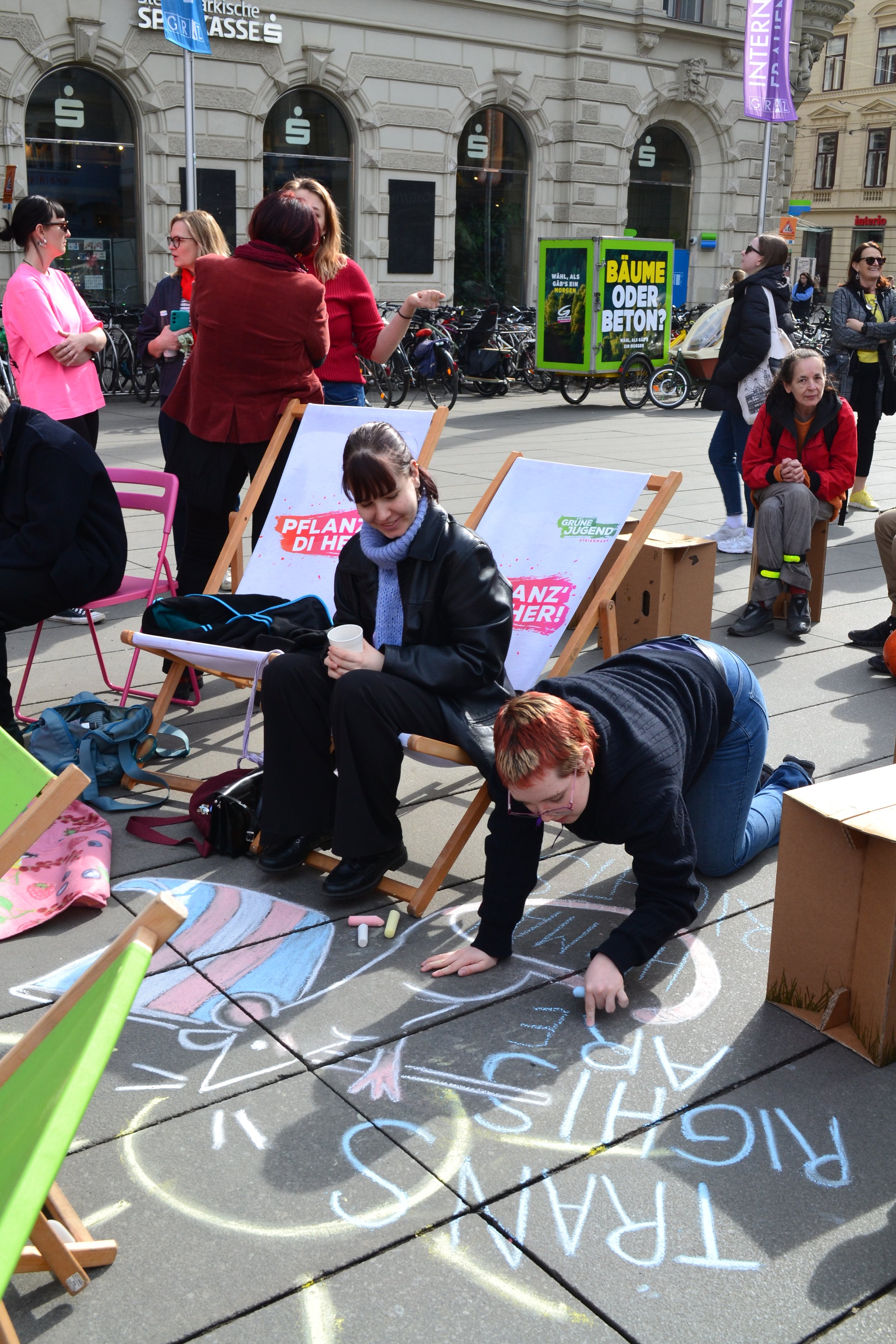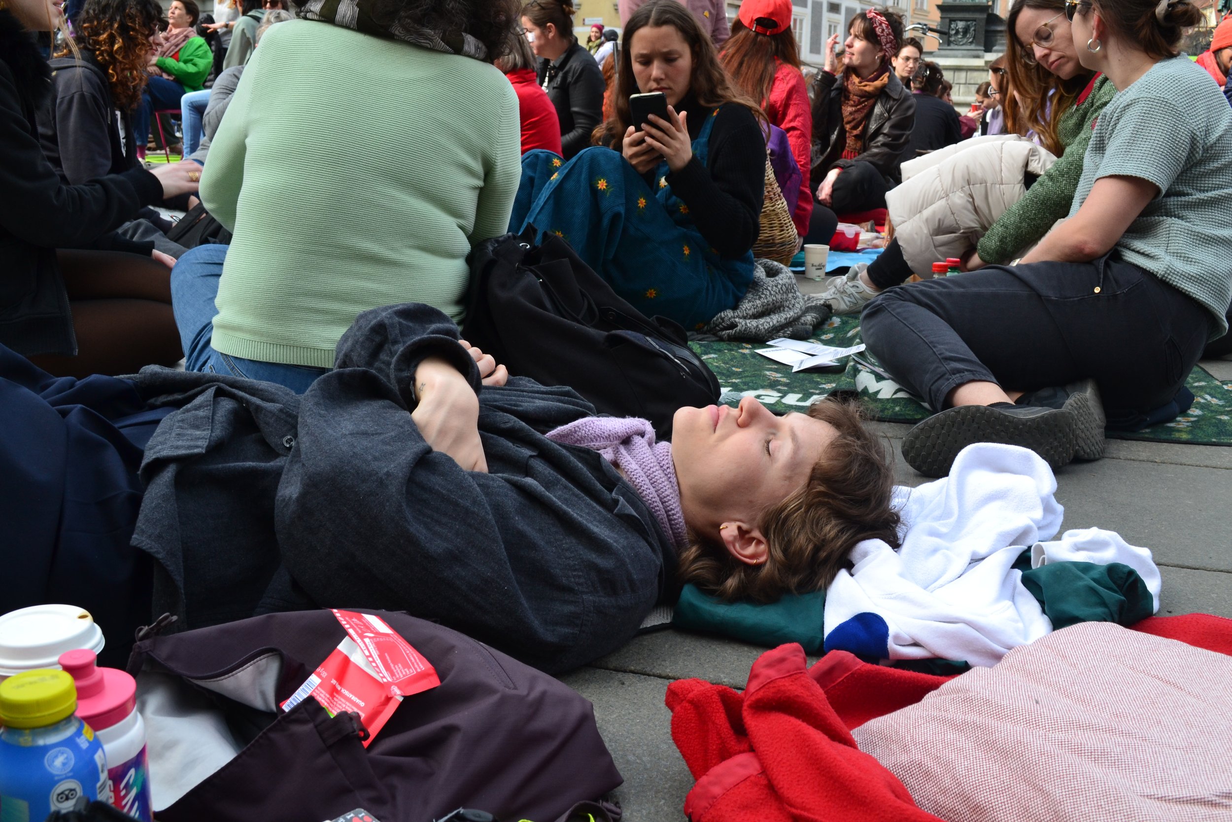 Der Grazer Frauenrat lud gemeinsam mit dem Bündnis 0803* von 12 bis 14 Uhr zur Aktion „Freie* Frauen* am 9. März - Versammlung zum Nichtstun“ ein – Name war Programm. Frauen haben sich von Erwerbs- und Sorgearbeit freigenommen, statt zu arbeiten, zu organisieren und zu funktionieren.